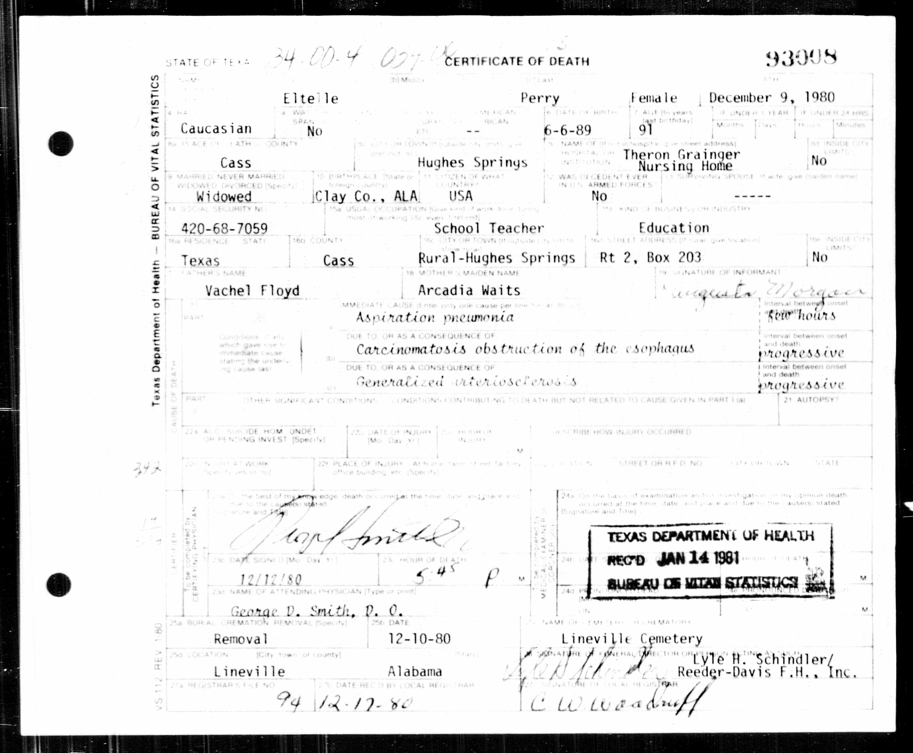 | Death: | 9 DEC 1980; Hughes Springs, Cass County, Texas Ref: [9] |